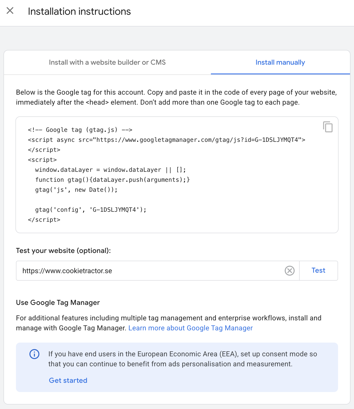 Men för att visa hur Google Consent Mode fungerar, och för att kunna verifiera installationen, lägger vi till Google Analytics 4 på webbplatsen.