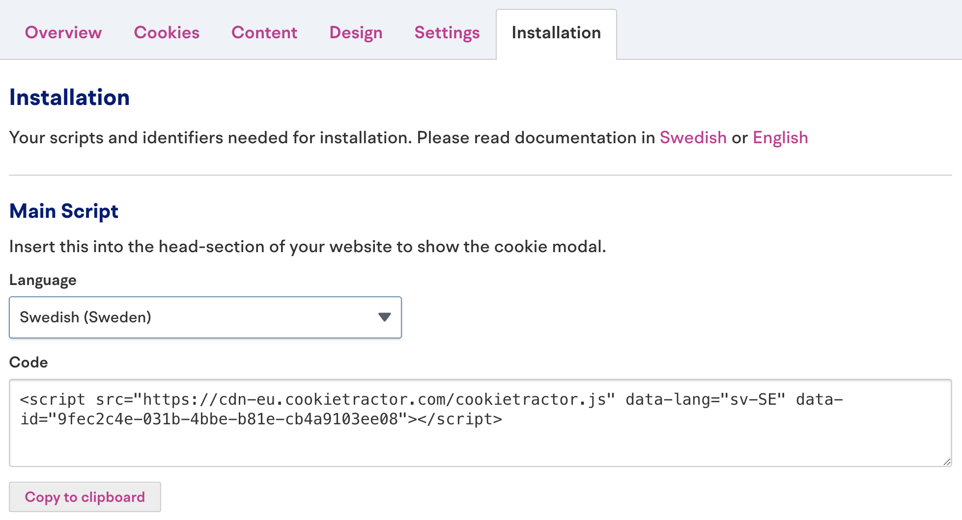 När ditt CookieTractor-konto är konfigurerat och du skapat en webbplats hittar du vårt huvudsakliga script under fliken Installation. Kopiera koden och klistra in den i <head>-sektionen i HTML:en.