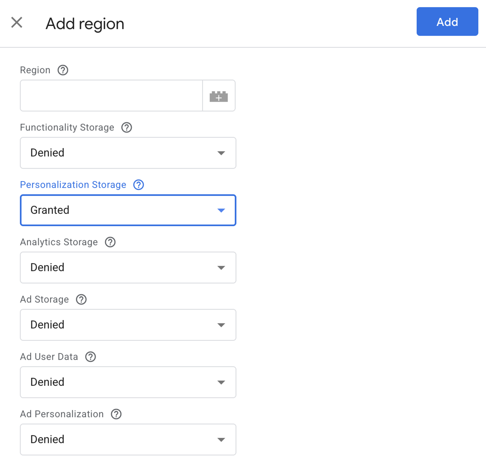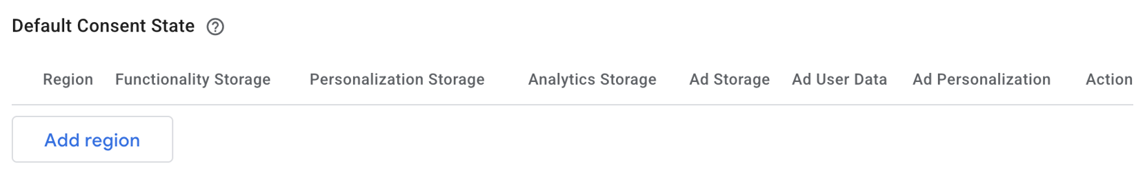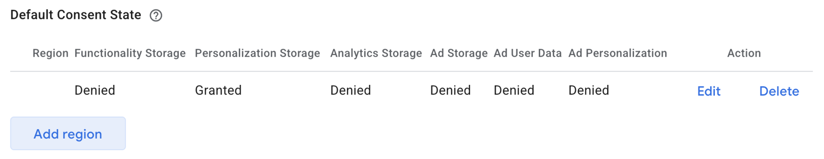 Inne i Google Tag Manager öppnar ni taggen så att den går att konfigurera. Under rubriken Default Consent State finns det möjlighet att lägga till anpassningar för regioner, som matchas med ISO-3166-1. Om ni vill ändra defaultvärdet för hela världen lämnas regionsfältet tomt.